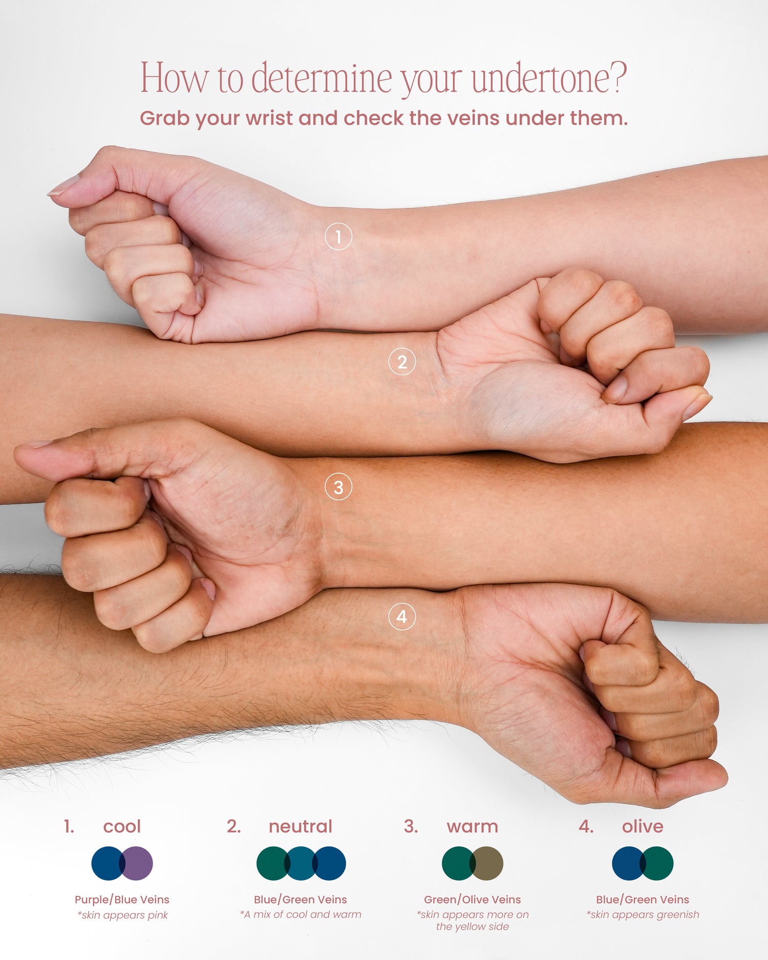 Hello there, Goal-getter! Here's our guide to knowing your undertone. When you look at your wrist veins in natural light, you'll be able to see what undertone you have. If your veins appear green (or olive), you likely have warm undertones, suggesting a warmer complexion. If your veins appears blue or purple, you probably have cool undertones. If your veins appear the combination of both, this could indicate neutral undertones. Lastly, if your veins show a bluish-green tinge and your skin has a greenish hue, you may have olive undertones.