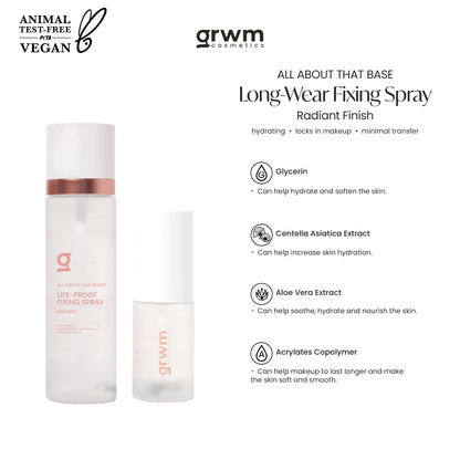 A radiant finish fixing spray that can help your makeup stay in place. The GRWM Long-Wear Fixing Spray also contains ingredients that can help hydrate & moisturize the skin.